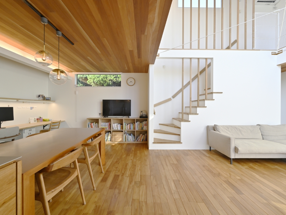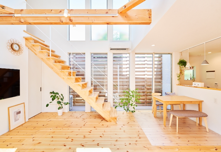 構造材(柱・土台)には、大自然で育った国産ヒノキを使用。床材には、柔らかさが素足に伝わる無垢パイン材を採用しています。