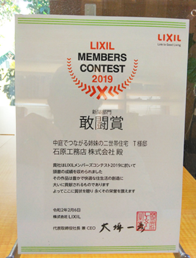 LIXILメンバーズコンテスト2019の新築部門にて、「敢闘賞」に<中庭でつながる姉妹の家>が受賞いたしました。スタイリッシュなだけでなく機能的であり、何より住みやすい。二世帯のご家族が、自分らしく過ごすための工夫・アイデアを詰め込みました。