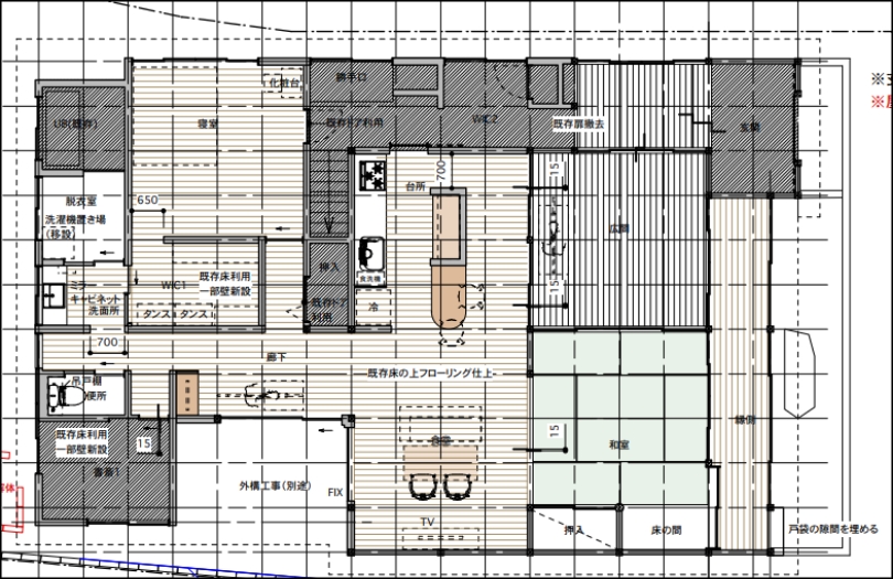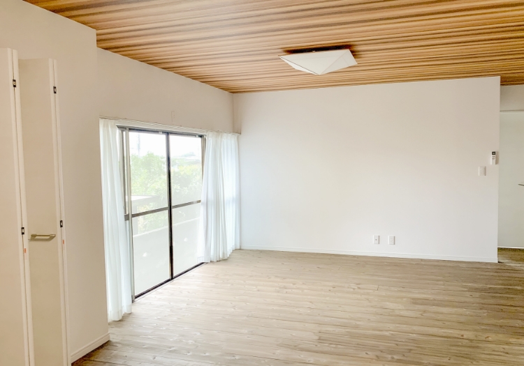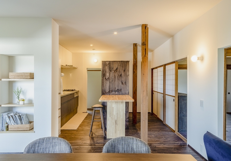 壁をマイナスすることと、キッチンの移設により各方面からの動線の良いLDKとして大空間が生まれました。