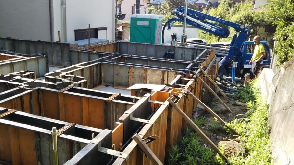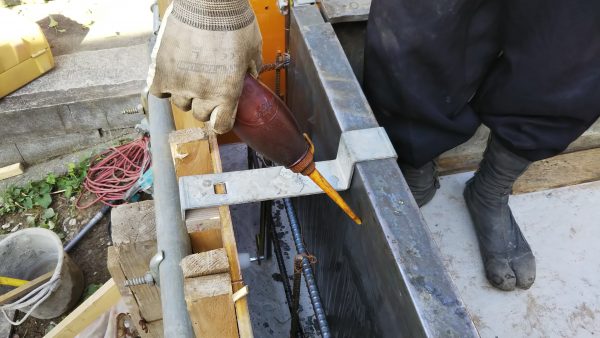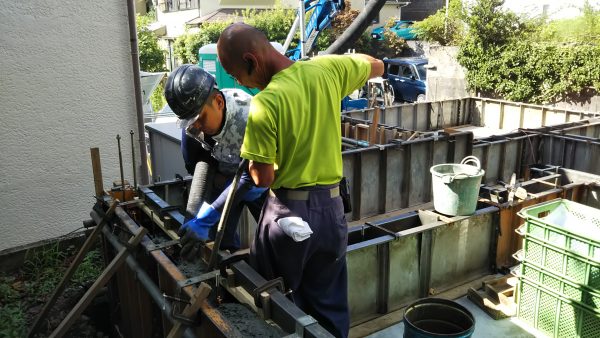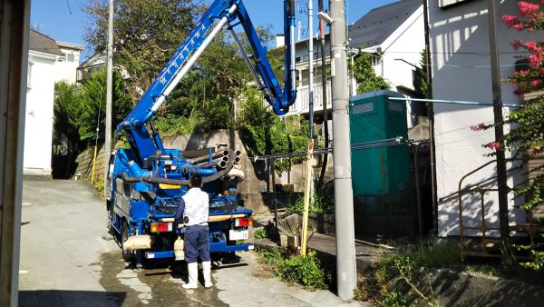 さて、準備を終えて先ほどの長い首のコンクリートポンプ車からコンクリートが流し入れられます。