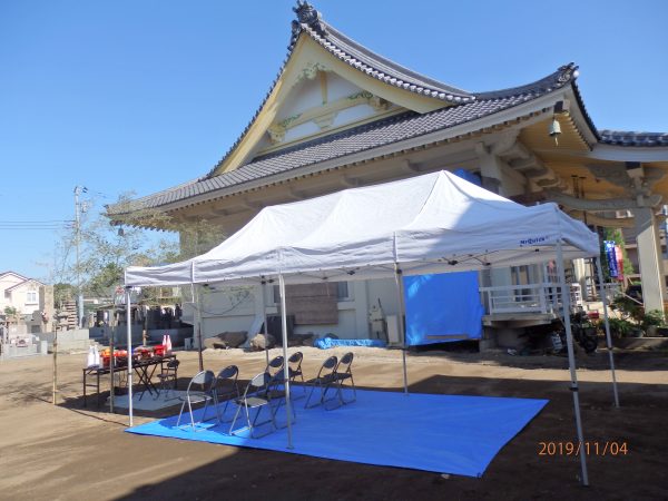 創建は諸説あるそうですが、1619年に現在の茅ヶ崎市小和田に開かれたそうで、現住職さんで18代目だそうです。約400年も続く歴史ある寺院なんですね。今回は、こちらのお寺の客殿の新築工事のための地鎮祭でした。