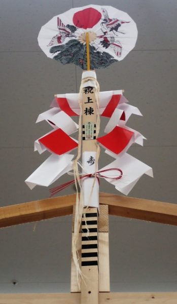 上棟式は、棟上げが終了したときに、建物の守護神を祀って感謝し、無事完成することを祈願する儀式です。幣串という飾りを、一番高い棟木に取り付けます。そして、完成後も屋根裏に設置され、その家を見守ります。