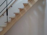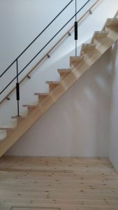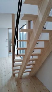 天然木の踏み板に、黒い鉄骨の繊細な線がとても美しい階段です。