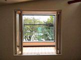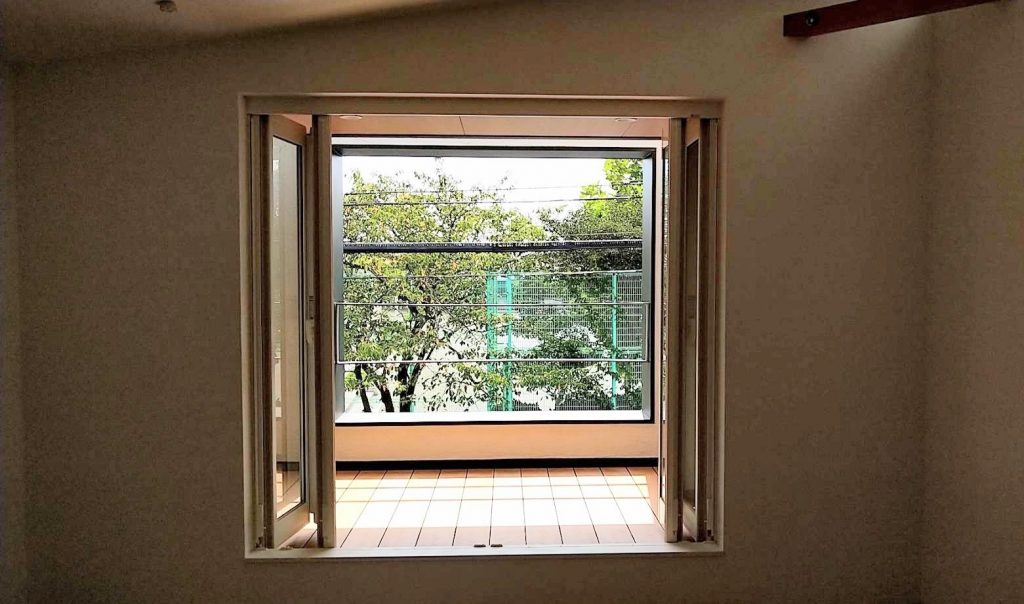 こちらの写真は、2階リビングの窓の写真です。ガラス扉が両側に折れる、全開口窓です。