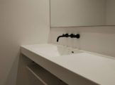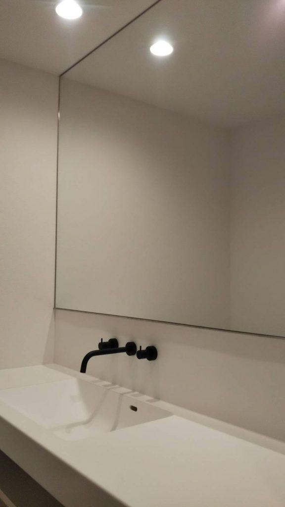 洗面カウンター上の壁面には、天井までの高さと、部屋の間口いっぱいの幅で鏡を設置いたしました。