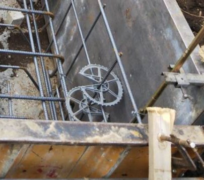 上の写真の右下部分を拡大したものなのですが、何やら輪のようなものが二つ設置されていますね。こちらは、「かぶり厚さ」というものをつくるためのスペーサーだそうです。鉄筋をコンクリートで覆うのですが、コンクリートの表面と鉄筋の表面までの距離をつくるためのものだそうです。コンクリートはアルカリ性で、鉄筋が錆びることから守ってくれるのですが、表面から徐々に中性化していく習性があります。そして、ひび割れなどから水がしみ込み、鉄筋が錆びてしまう原因となってしまうので、そうならないように、「かぶり厚さ」で防いでいるのですね。