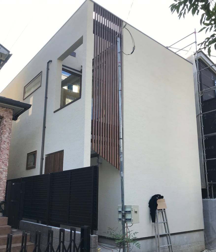 白い壁にこげ茶色の木製ルーバーがメリハリをつけていて、カッコいい外観に仕上がっています。