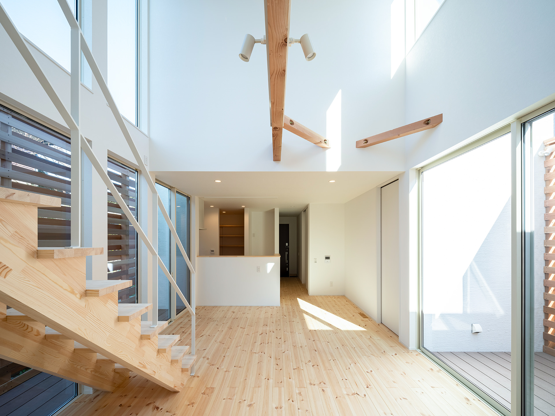 路地裏の隠れ家的サロンを実現し、プライベート空間であるリビングダイニングは、旗竿地であるがゆえのデメリットを一つ一つ解決し、日当たりの確保、風通しの工夫、プライバシーの確保という課題をクリアした、まさに、旗竿地の特徴を活かした家づくりに成功した事例です。