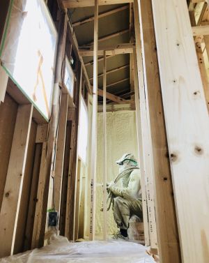 完全防備で、断熱材を吹き付け作業中の業者さんです。