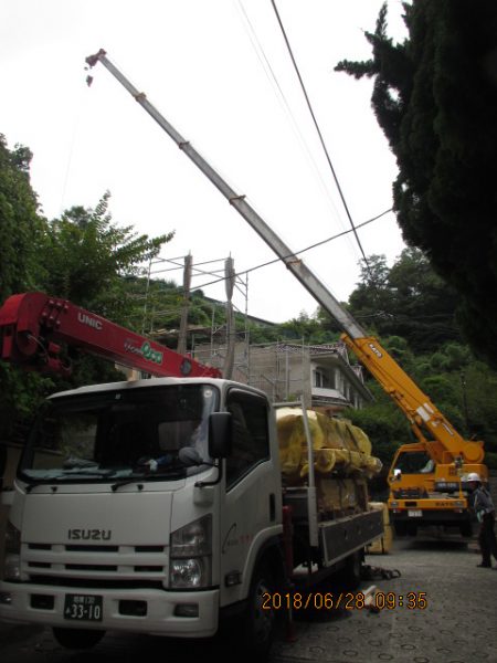 15メートルほど伸ばしたクレーンが建材を吊り上げ、棟梁の見事な誘導と