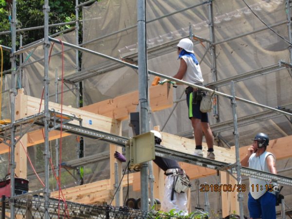 その建材を、今度は身軽にひょいひょい動き回る大工さん達が次々と組み立てて