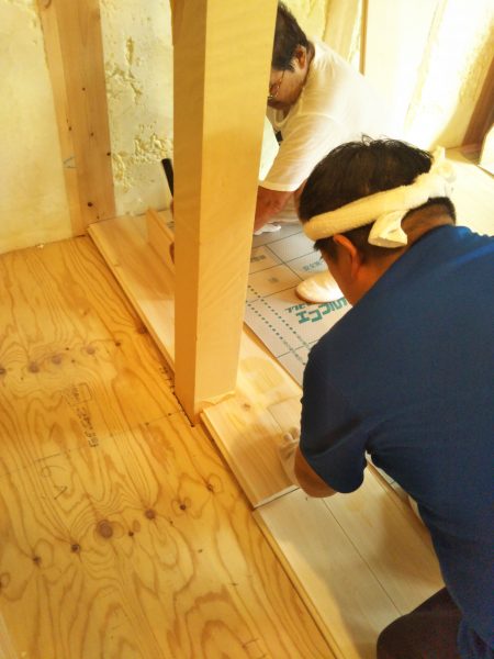 何度も何度も微調整を繰り返し、柱の周りもピッタリ隙間なく貼られた床。