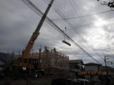 朝早くから現場には大工さん達が集合し、賑やかに始まっていました。大型のクレーンも空高く伸ばしています。