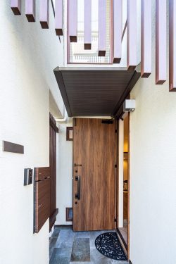 コンパクトな土地ながらも少し奥まった玄関ポーチ。それでも空間の使い方で開放感すら感じます。