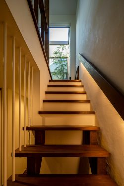 手すり下部分に埋め込まれた間接照明が夜の玄関ホール、階段を落ち着いた大人の空間に演出しています。