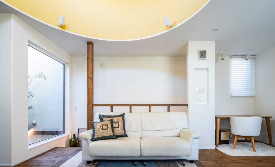 A様邸の絶妙な空間術を象徴するようなインパクトのある吹き抜け。優しい黄色の壁色が空間に広がりをもたせています。