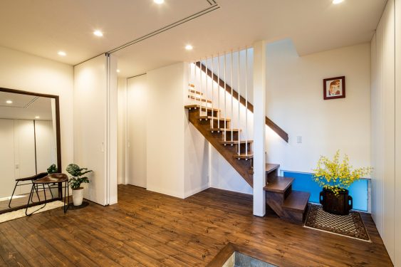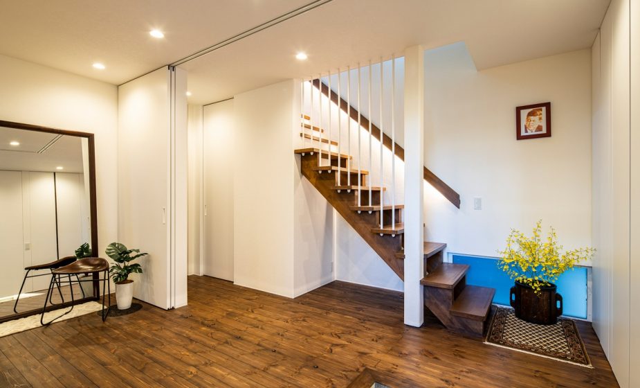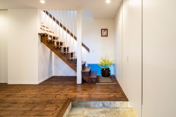 玄関扉を一歩入ればフローリングの茶色と白一色の壁のコントラストが美しく、広々とした玄関ホールにおどろかされます。