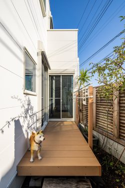 LDKと玄関ホールに面したウッドデッキ。外からの視線をさえぎり、内からは開放感を実感できます。