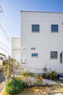 家全体の印象を決める外壁。シンプルな白で統一感のある外観は、窓のバランスも考えられ、美しいですね。