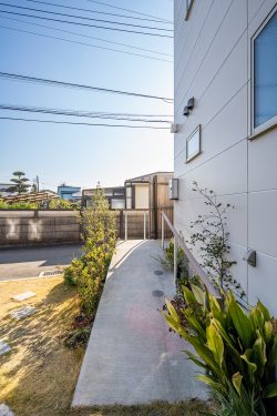 やさしい雰囲気の植栽が出迎えてくれるアプローチを通って玄関へ。