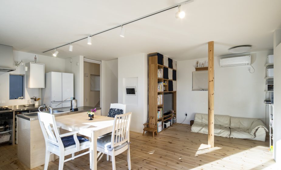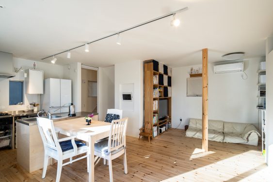 明るいLDK。無垢のパイン材のフローリングの気持ち良さは写真からも伝わってきます。