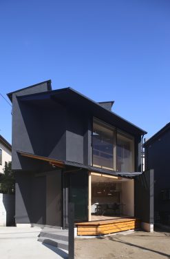 路地を入るとあらわれる外観は、同じ方向を向いた家ばかりの住宅街で一軒だけ45度南に向いていて、ひときわ存在感があります。