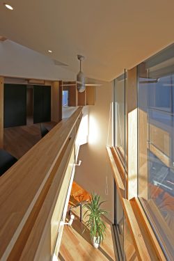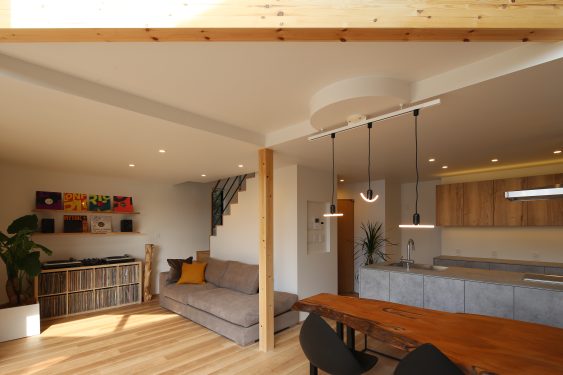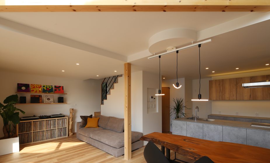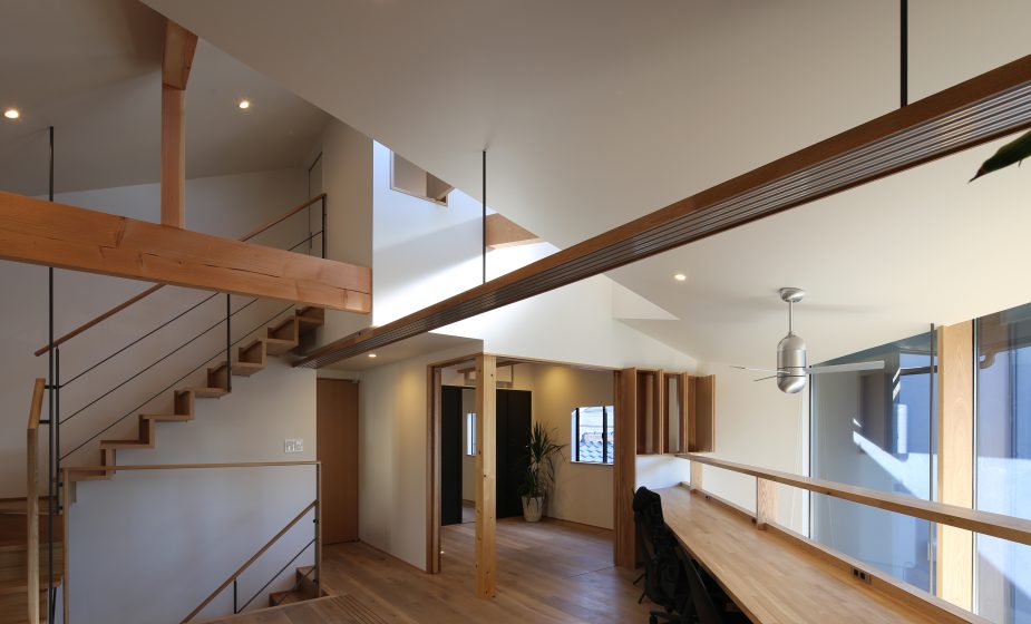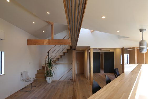 2階にいる家族、1階にいる家族、外にいる家族をつなげる吹き抜けのあるLDK。