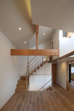 勾配のある天井が交差し、上への伸びやかな空間の広がりが気持ち良いです。