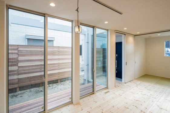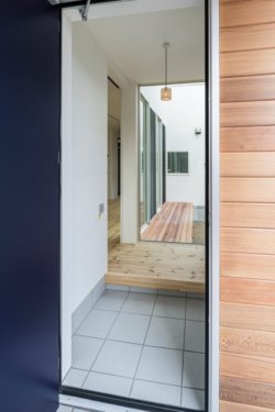 玄関ドアを開けると 大きな窓から中庭を臨めます。