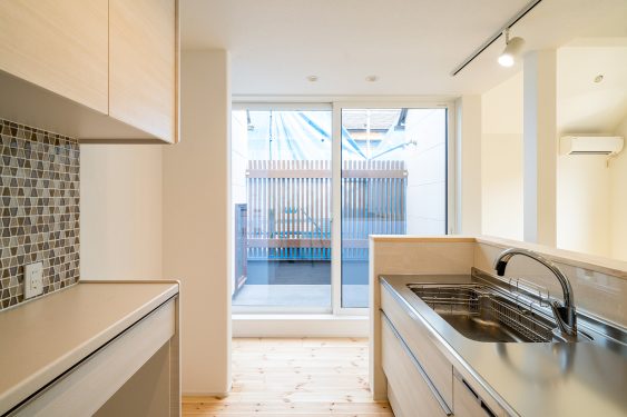 キッチンからの中庭の眺め。無機質になりがちなキッチンも、外の景色がすぐ近くにあるだけで雰囲気が変わります。