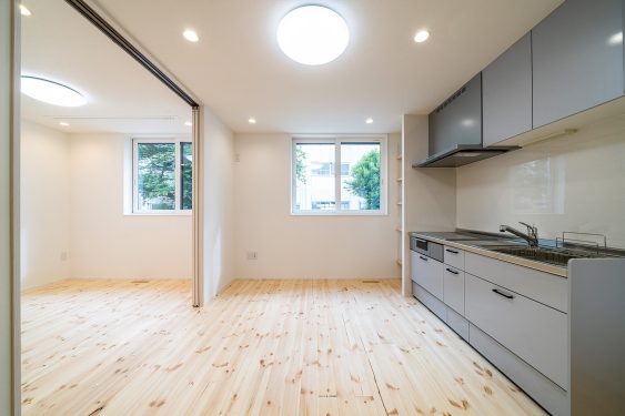 1階のお母様世帯のLDKと居室。オール電化のため、キッチンのお手入れもしやすく、室内で火を使わないので安心です。
