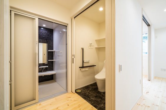 1階お母様世帯の浴室とトイレ。扉を引き戸にしたり、介助者も入れる広めのスペースを確保したバリアフリーへも配慮したつくりです。