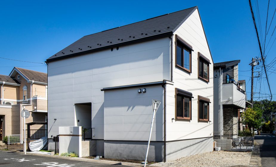 屋根材は高性能板金を採用。外壁はコスト面を鑑み、フラットウォールサイディングを採用しました。プレーンでフラットな味わいは、シンプルな外観によく馴染みます。