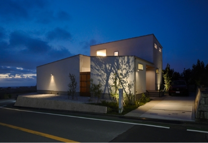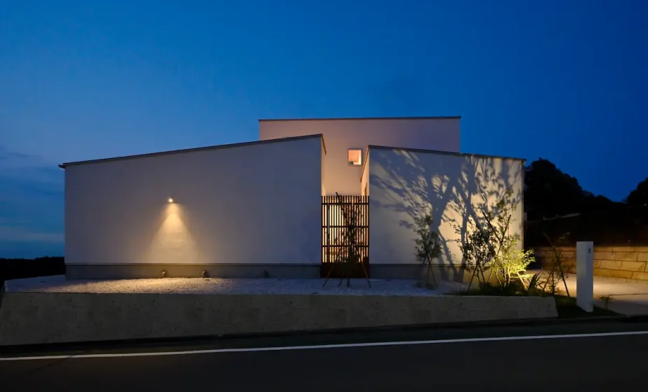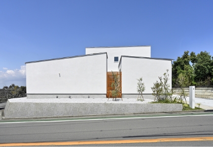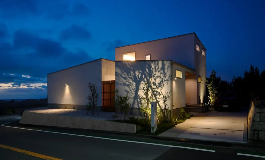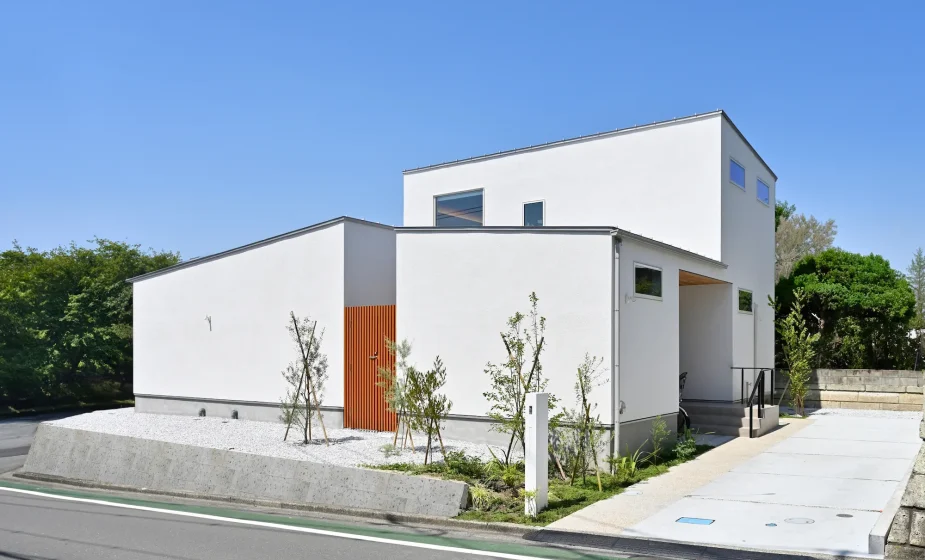 白亜の壁が青空に美しく映えるシンプルモダンな外観。2方向道路の角地に建ち、周辺でも目を引く印象的な佇まい。