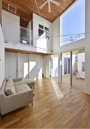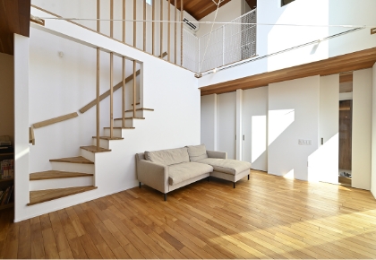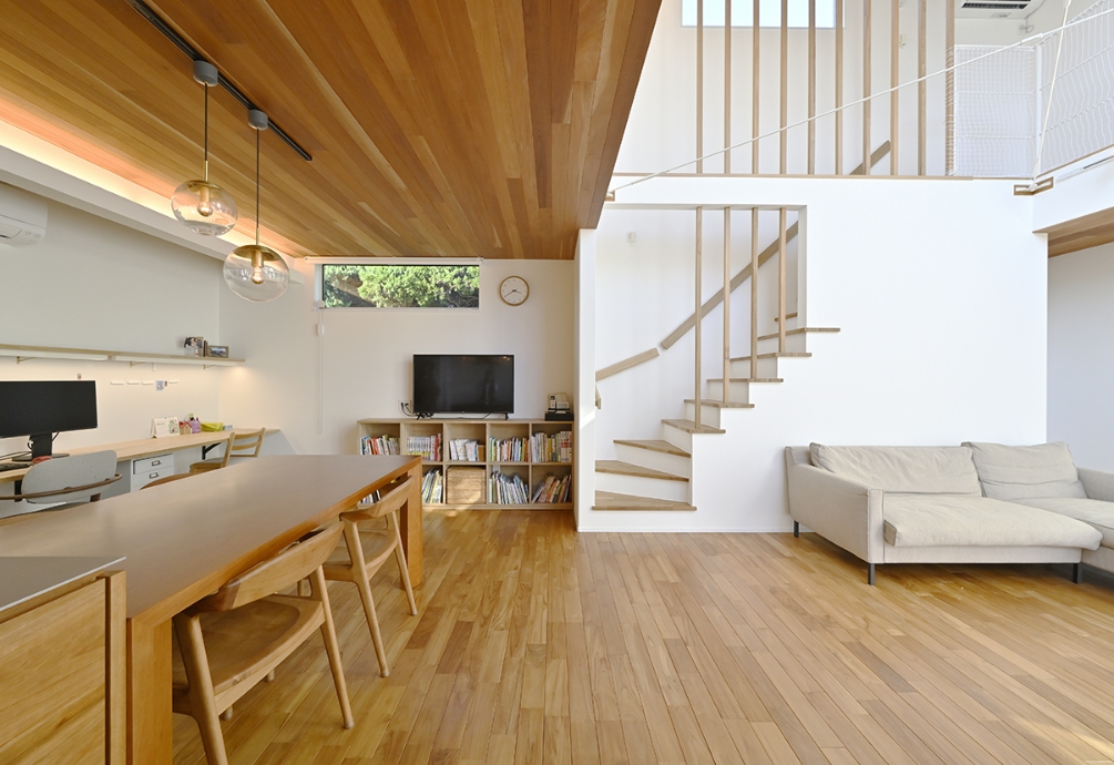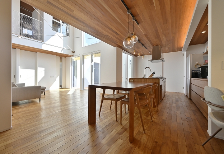 伸びやかな住空間道路からは窓がないように見えるK様邸ですが、一歩室内に入れば、明るい日差しが降り注ぎ、木の温もりあふれる吹き抜けの大空間が広がっています。