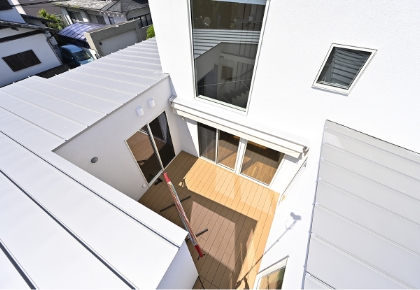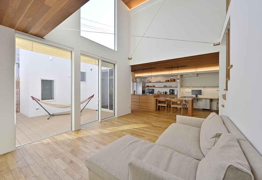 中庭のある家採光のために大きな窓を設けても、人の目が気になってカーテンを閉めてしまうのが現実では? そんな懸念も、“外に閉じて中に開く”中庭の提案でクリアできました。