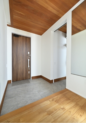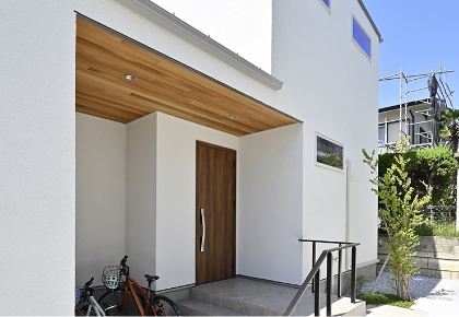 庭・玄関軒天や玄関扉に木目調の部材を採用し、温もりを演出した玄関まわり。軒を深くすることで駐輪スペースやポーチが雨に濡れないように設計されています。