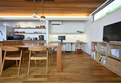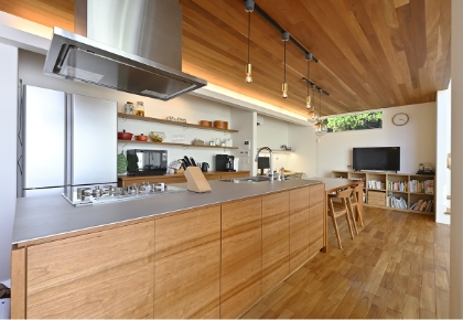 リビング海外で暮らした家をイメージし、天然木にこだわったリビング。天井はマホガニー、床はチークと、美しい樹種を採用しています。