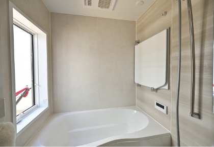浴室中庭に面した浴室は、外の視線を気にする必要がなく、窓を開けて入浴することができます。「窓を大きめにしたので星空も眺められます」。