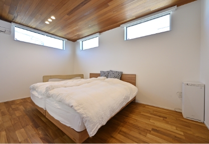 主寝室約9畳の2階主寝室。窓は採光を確保できる高さと最小限のサイズとにとどめ、余計な家具もありません。プライバシーと安眠できる環境を重視したシンプルな空間です。