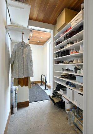 シューズクローク玄関の土間に設けたシューズクローク。雨に濡れたレインコートをそのまま掛けたり、かさばる荷物を置くこともできます。