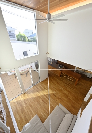 吹き抜け高さ5m超のダイナミックな吹き抜け。構造梁はホワイトの鉄骨製を選択し、空気を循環させる天井のシーリングファンも同色で揃えて、美しくスタイリッシュな空間に。