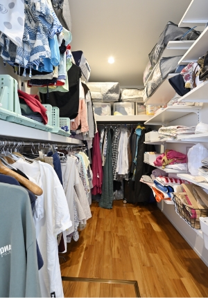ファミリークローゼットキッチンの側には収納量たっぷりのファミリークローゼットを設けました。