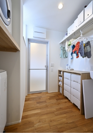 脱衣室脱衣室兼ランドリースペース。広めの空間にはガス式乾燥機や室内干しスペース、アイロンがけができる棚、スロップシンクも備えられています。