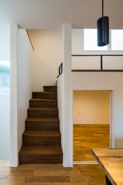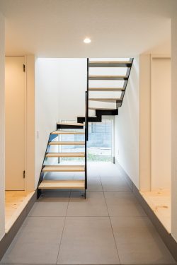 玄関を開けると目に飛び込んでくるのはお洒落なスケルトン階段。地窓を設けたことにより、プライバシーを保ちながらも明るさを取り入れることが出来、開放的な玄関ホールが完成しました。
