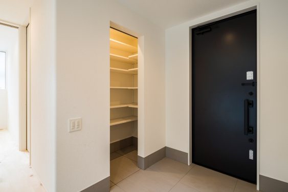 大容量の収納力を誇るシューズインクローゼットを完備しています。家族のシューズや傘、アウトドア用品や防災用品の備蓄倉庫として大活躍のスペースです。