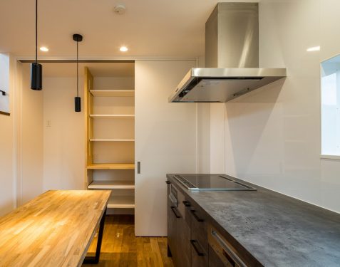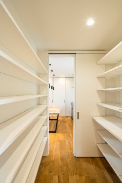 リビングとキッチンの間には大容量のパントリーがあり、リビング側、キッチン側どちらからも入ることができます。使い勝手抜群です。片付け、整理整頓もストレスなくはかどりそうです。