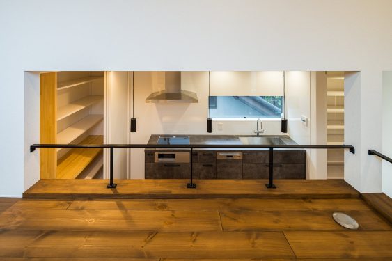 ロフトからの眺めです。キッチンは壁付けになっていますが、ママがお料理中でもリビングで遊ぶお子様をウォークスルーのパントリー越しに見守ることができ、また、ロフトで遊んでいれば気配を感じることができます。オーナー様のアイデア満載で、家族とのコミュニケーションを取りやすい、素敵な間取りが実現しました。