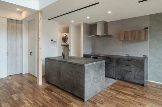 キッチンを中心にすぐ横にはパントリーと洗濯機、乾燥機のスペースがあります。洗面所やトイレ、収納もキッチンからのアクセス抜群な動線となっています。水回りがコンパクトにまとまっている参考にしたい間取りです。