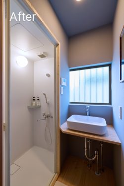 造作の洗面台などを備え付けて、宿泊される方の利便性がアップ。また、床をパイン材に変えることで印象が明るくなりました。